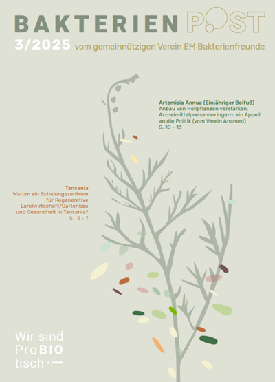 Viermal im Jahr erscheint unsere BakterienPost – ein Magazin rund um Gesundheit, Natur und nachhaltiges Leben. Jürgen Amthor, Gründer der Eußenheimer Manufaktur und Präsident unseres Vereins, berichtet darin über spannende Entwicklungen im Tansania-Projekt, aktuelle Gesundheitsthemen, regenerative Landwirtschaft, Gartenwissen und vieles mehr. Und natürlich sind sie immer mit dabei: unsere kleinen, aber wirkungsvollen Helfer – die Effektiven Mikroorganismen.